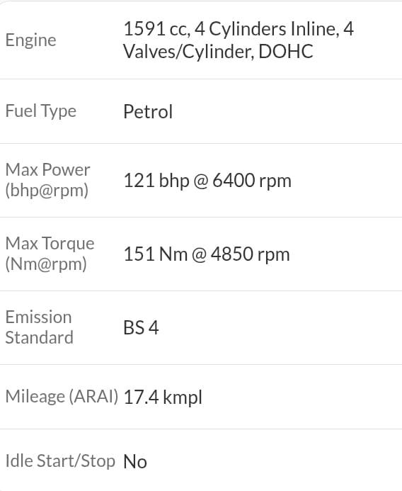 Max Power (bhp@rpm) 121 bhp @ 6400 rpm, Max Torque (Nm@rpm) 151 Nm @ 4850 rpm, Bootspace – 465 litres, Ground Clearance – 165 mm, Mileage (ARAI) – 17.4 kmpl, Fuel Tank Capacity – 45 litres, Wheels – Alloy Wheels, Sunroof – NO, Airbags – 02, Tyre Size –195/55 R16, We provide 6 months warranty on Engine and Gearbox for mentioned vehicle, 1% TCS applicable on transaction above 10 Lakhs refundable and by Govt. Insurance RTO charges extra, if applicable. Monday Our Showroom Is Closed. This Vehicle Registration Date Is 18-09-2017 And Manufacturing Date Is 08-2017. NCAP rating of this vehicle is 5 Star.