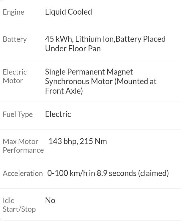 Max Power (bhp@rpm) 143 bhp @ 215 nm, Bootspace – 350 litres, Ground Clearance – 190 mm, Battery – 40.5 kWh, Driving range – 465 km, AC Fast Charging – 10-100% : 6hrs, 7.2kW charger, DC Fast Charging – 10-80% : 56mins, 50 kW charger AC Regular Charging – 10-100% : 15hrs, 15A plug point, Wheels – Alloy Wheels, Sunroof – Yes, Airbags – 10, Tyre Size – 215/60 R16, Insurance RTO charges extra, if applicable. Monday Our Showroom Is Closed. This Vehicle Registration Date Is 04-11-2023 And Manufacturing Date Is 10-2023. NCAP rating of this vehicle is 5 Star. This Vehicle is Empowered Long Range.