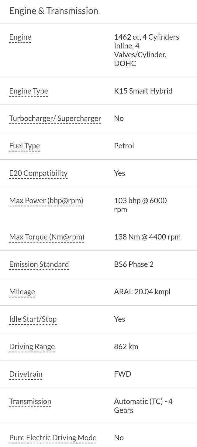 Max Power (bhp@rpm) 103 bhp @ 6000 rpm, Max Torque (Nm@rpm) 138 Nm @ 4400 rpm, Bootspace – 510 litres, Ground Clearance – 170 mm, Mileage (ARAI) – 20.04 kmpl, Fuel Tank Capacity – 43 litres, Wheels – Alloy Wheels, Sunroof – No, Airbags – 02, Tyre Size – 185/65 R15 , We provide 6 months warranty on Engine for mentioned vehicle, 1% TCS applicable on transaction above 10 Lakhs refundable and by Govt. Insurance RTO charges extra, if applicable. Monday Our Showroom Is Closed. This Vehicle Registration Date Is 09-10-2024 And Manufacturing Date Is 08-2024.