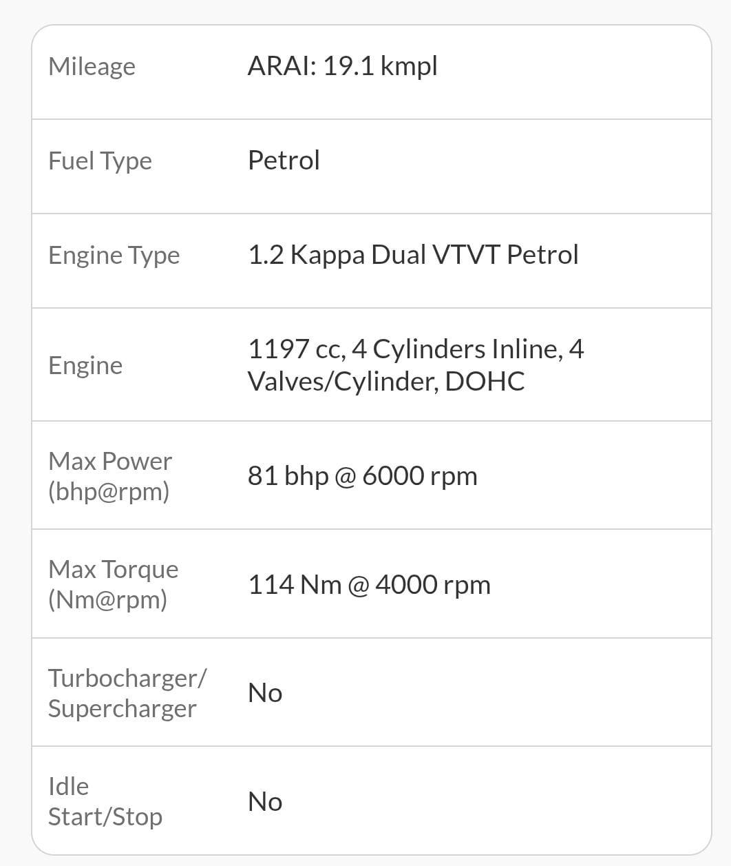 Max Power (bhp@rpm) 81 bhp @ 6000 rpm, Max Torque (Nm@rpm) 114 Nm @ 4000 rpm, Bootspace – 407 liters, Ground Clearance – 165 mm, Mileage (ARAI) – 19.1 kmpl, Fuel Tank Capacity – 43 liters, Wheels – Steel Rims , Sunroof – No, Airbags – 02, Tyre Size – 175/65 R14, 1% TCS applicable on transaction above 10 Lakhs refundable and by Govt. Insurance RTO charges extra, if applicable. Monday Our Showroom Is Closed. This Vehicle Registration Date Is 03-04-2017 And Manufacturing Date Is 02-2017. THIS CAR IS SOLD ON “AS IT IS WHERE IT IS” BASIS.