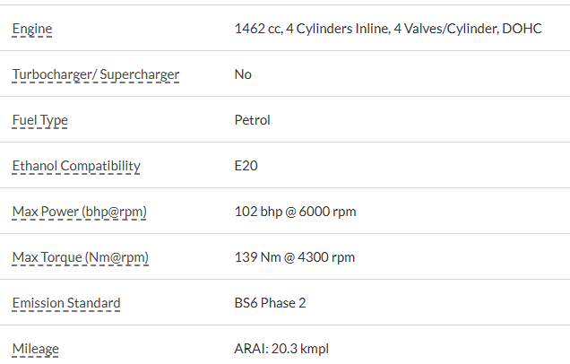 Max Power (bhp@rpm) 102 bhp @ 6000 rpm, Max Torque (Nm@rpm) 139 Nm @ 4300 rpm, Boots pace – 209 litres, Ground Clearance – 185 mm, Mileage (ARAI) – 20.3 kmpl, Fuel Tank Capacity – 45 litres Wheels – Alloy Wheels, Sunroof – No, Airbags – 04, Tyre Size – 185/65R15 We provide 6 months warranty on Engine for mentioned vehicle, 1% TCS applicable on transaction above 10 Lakhs refundable and by Govt. Insurance RTO charges extra, if applicable. Monday Our Showroom Is Closed. This Vehicle Registration Date Is 29-10-2024 And Manufacturing Date Is 07-2024.